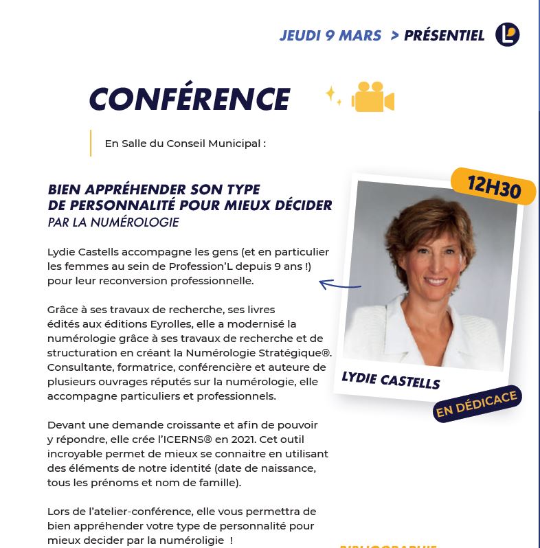 - Pour ceux qui le souhaitent, Lydie Castells dédicacera ses livres : “Numérologie », « Numérologie, votre année personnelle », “Intuition, si on l’écoutait vraiment ?” et « Le potentiel de votre Enfant par la Numérologie » tous aux Ed Eyrolles. Ainsi que ses deux coffrets « La numérologie en action » et « la petite boite de la numérologie pour une impulsion positive dans la journée » – Ed. Trédaniel.